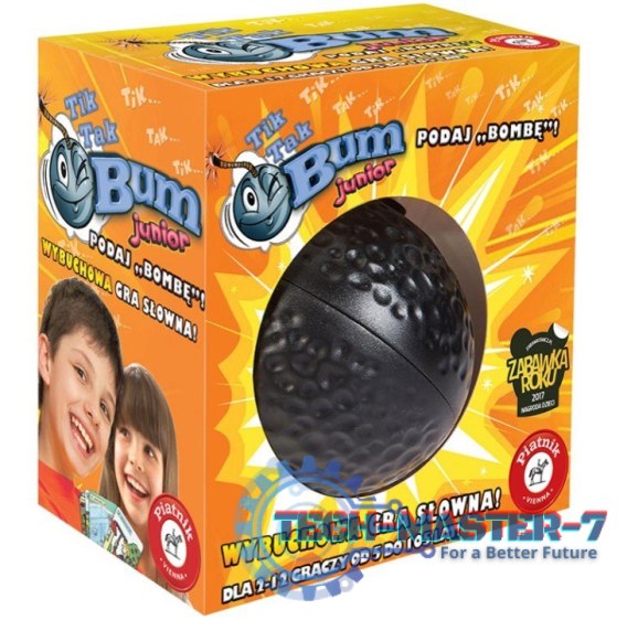 Tik Tak Bum Junior Gra Podróżna składa się ze 50 dwustronnych kart z hasłami i obrazkami przedstawiającymi różne miejsca i sytuacje oraz wybuchającej bomby! Uruchomiona bomba może wybuchnąć w losowym momencie może tykać minutę, 30 sekund lub tylko 10! Bomba potrzebuje dwie baterie AAA 1,5 V (nie są załączone), by po wciśnięciu zapalnika zaczęła tykać.
