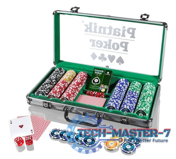 Zestaw 300 żetonów w aluminiowej walizce. Żetony z nominałami, waga po 14g, na każdym logo Piatnika. W komplecie ponadto: 2 talie 55 plastikowanych kart o pokerowym wymiarze 63 x 88 mm, 5 kości, żeton dla rozdającego i kluczyki do walizki. Dołączona instrukcja w języku polskim.